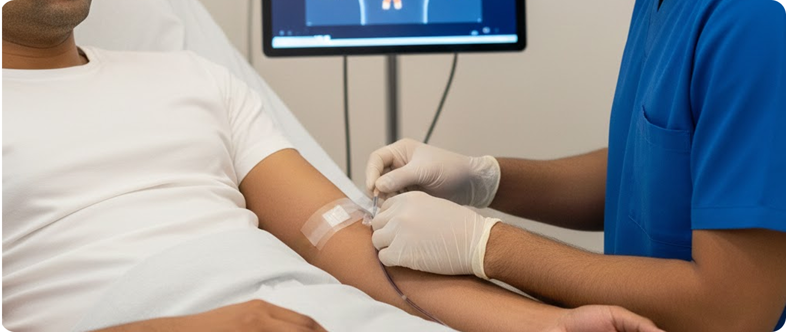A thin catheter is inserted through a blood vessel in your wrist or groin. No surgical cuts. No stitches. No general anaesthesia.