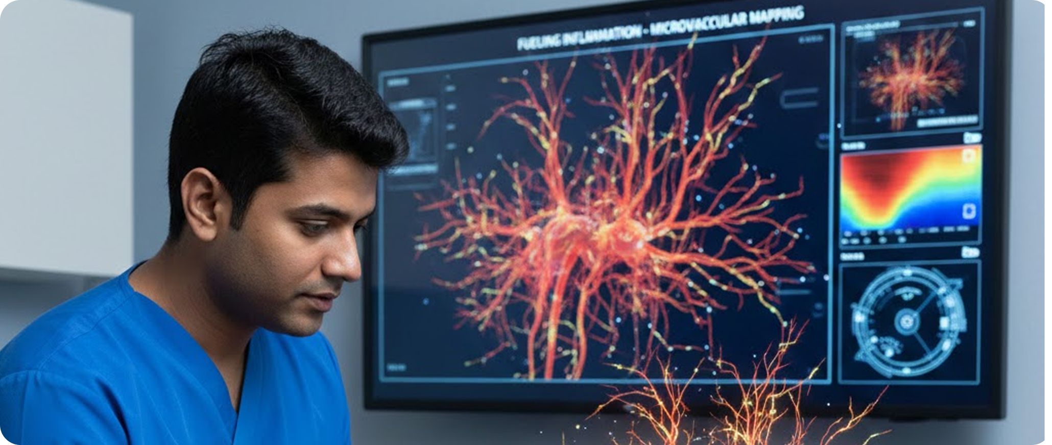 Using advanced imaging, the doctor maps tiny arteries responsible for fuelling inflammation around the shoulder capsule.